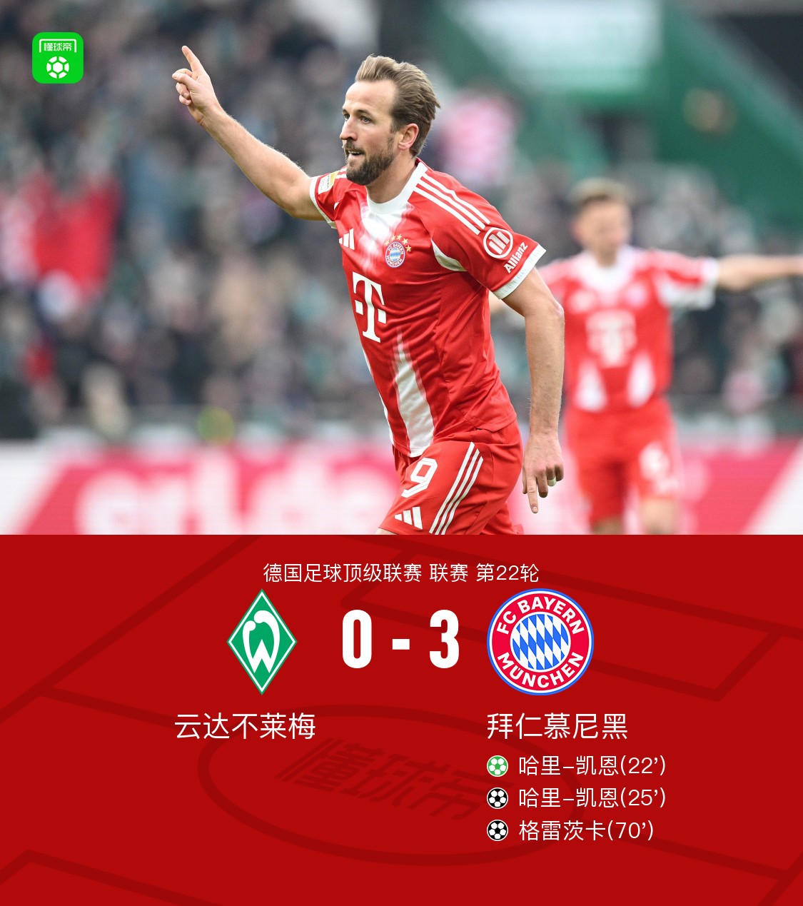北京时间2月14日德国足球顶级联赛联赛第22轮,云达不莱梅主场对阵拜仁慕尼黑。上半场卡尔禁区内连续过人后造点,凯恩主罚命中,随后凯恩精彩远射破门完成双响。下半场阿方索-戴维斯传球,格雷茨卡禁区内低射破门锁定胜局。最终拜仁3-0客胜不莱梅。点击查看本场比赛详细数据>>点击查看德甲完整积分榜>>关键事件第22分钟,卡尔禁区内连续过人后造点,凯恩主罚命中,拜仁1-0不莱梅第26分